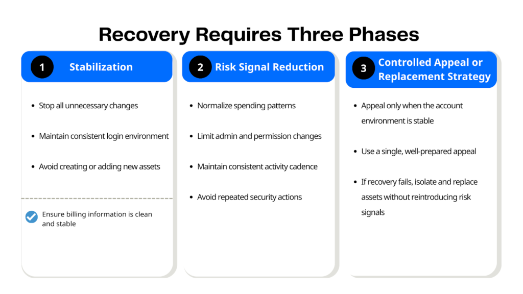 Successful recovery is less about “convincing Facebook” and more about reducing perceived risk.